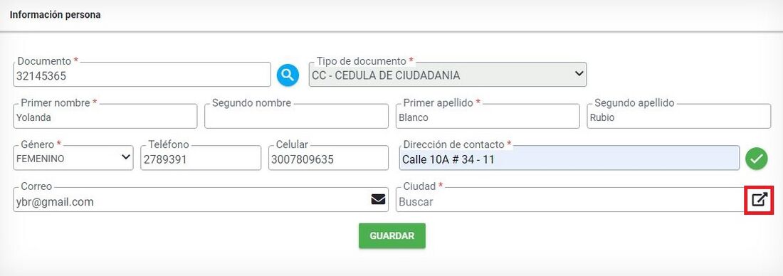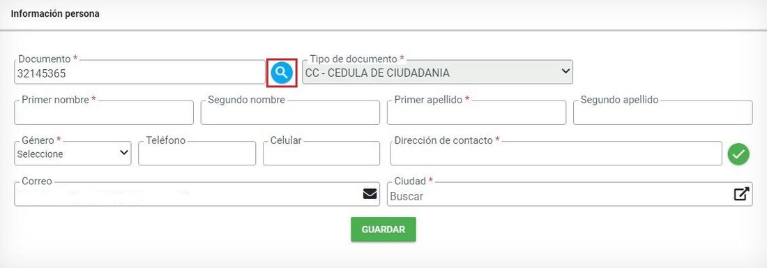 Si la persona no existe el sistema habilita todos los campos para su registro. Diligencia los campos nombrados a continuación, recuerde que los que tienen * son obligatorios: