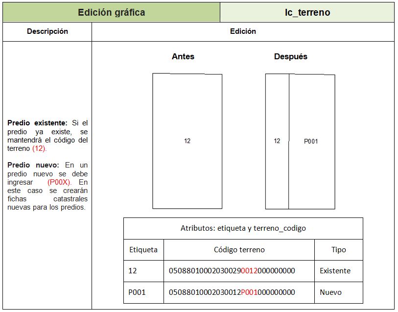 '''Edición gráfica capa terreno:''' En el siguiente cuadro se detallan de forma gráfica y con ejemplos la edición para los predios nuevos o existentes de tipo normal: | '''Edición gráfica capa terreno:''' En el siguiente cuadro se detallan de forma gráfica y con ejemplos la edición para los predios nuevos o existentes de tipo normal: | ||