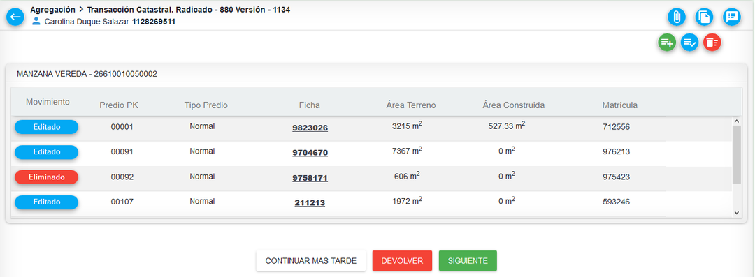 Por medio del botón FICHA PREDIAL se permite visualizar la información del predio.