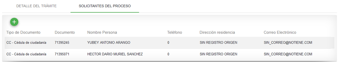 En esta sección se visualizan el o los solicitantes del proceso con la información del mismo | En esta sección se visualizan el o los solicitantes del proceso con la información del mismo | ||