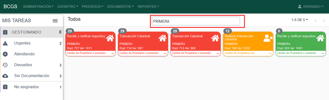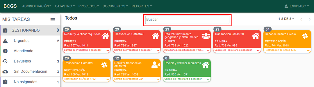 Inicialmente el sistema muestra el total de trámites, los cuales se identifican por medio del grupo llamado GESTIONANDO