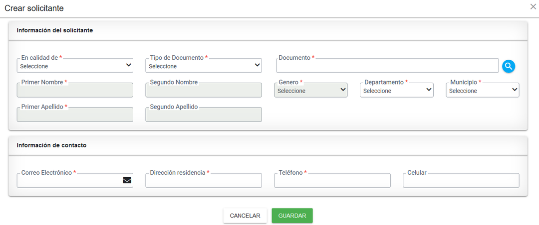 Dentro de esta sección se pueden registrar o modificar solicitantes, para agregar seleccionamos el botón Agregar nuevo solicitante