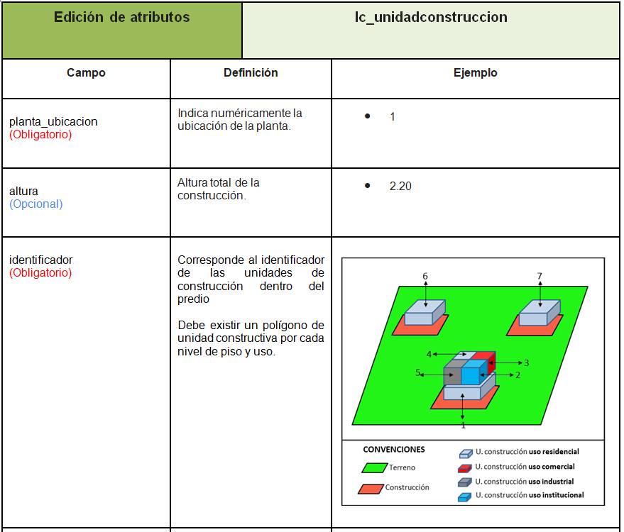 2. Edición atributos: En la capa lc_unidadconstruccion se deben registrar los atributos de los campos descritos a continuación: