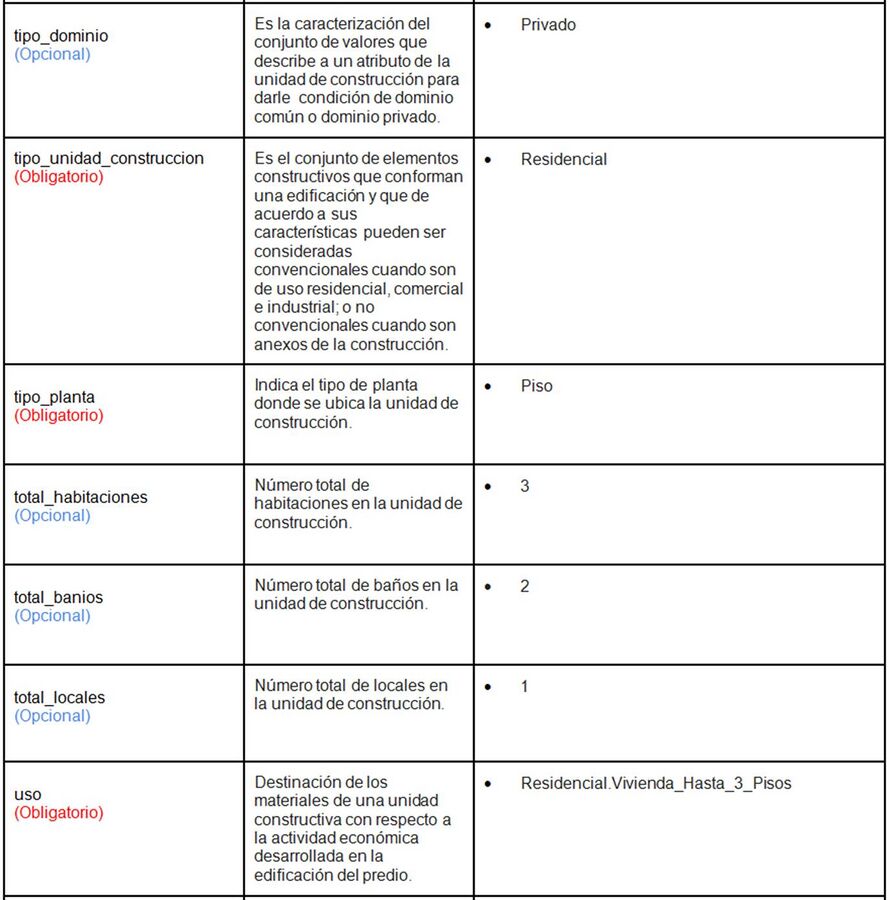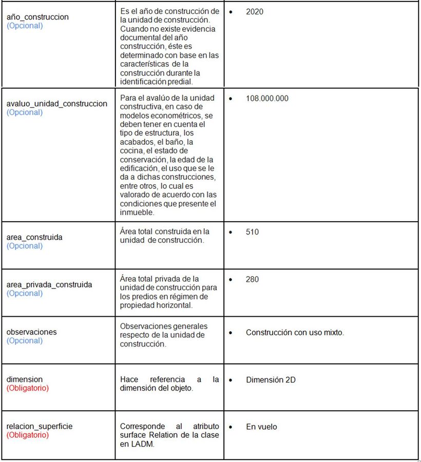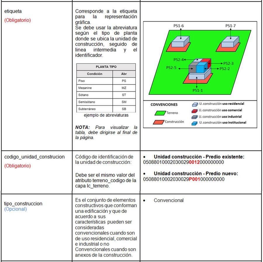 En la capa lc_unidadconstruccion se deben registrar los atributos de los campos descritos a continuación: