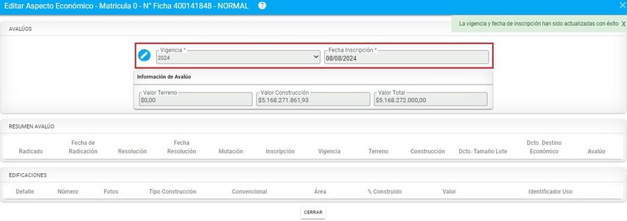 En el caso de informalidades en altura, en la ventana de aspectos económicos no se va a mostrar información de zonas, se muestra RESUMEN DEL AVALÚO y EDIFICACION.