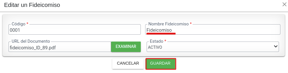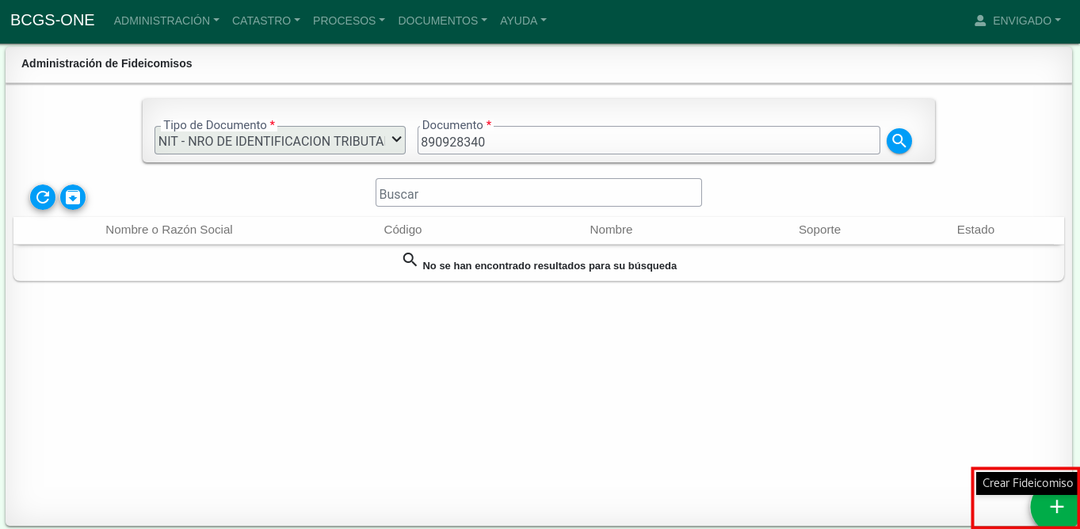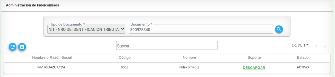 Esta funcionalidad permite realizar la creación de fideicomisos para asociarlo a un documento tipo NIT (Número de identificación tributaria).