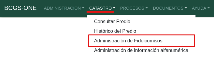 Para ingresar a esta funcionalidad se debe hacer clic en el ítem de menú Catastro > Administración de Fideicomisos.