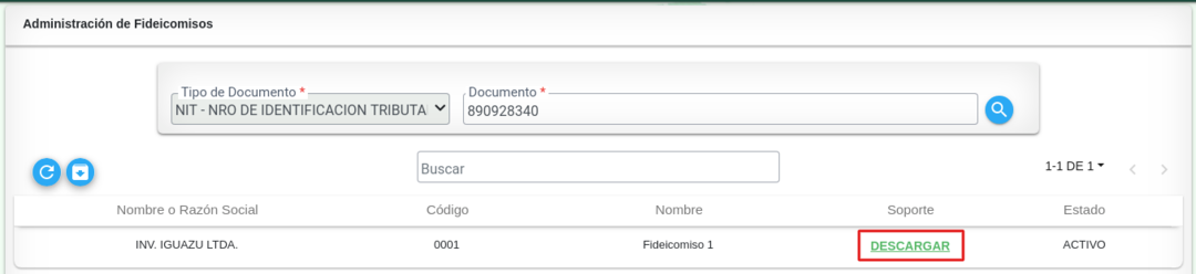 Seleccionar el enlace Descargar de la columna soporte para visualizar el documento que certifica el fideicomiso.