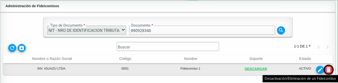 Hacer clic en el botón Desactivación/Eliminación de un Fideicomiso.