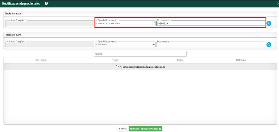 Este trámite es para rectificar un propietario, es decir, cuando este tiene malo su número de documento; ya sea cédula de ciudadanía, pasaporte, nit, entre otros. Para radicar este tipo de trámite, debe ingresar por Procesos