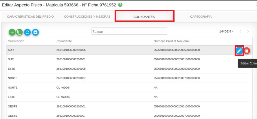 Seleccionar la pestaña de Colindantes y dar clic en el botón editar, este se encuentra al final de cada colindante.