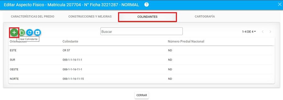 También, es posible incorporar un colindante nuevo, dar clic en el Botón Crear colindante