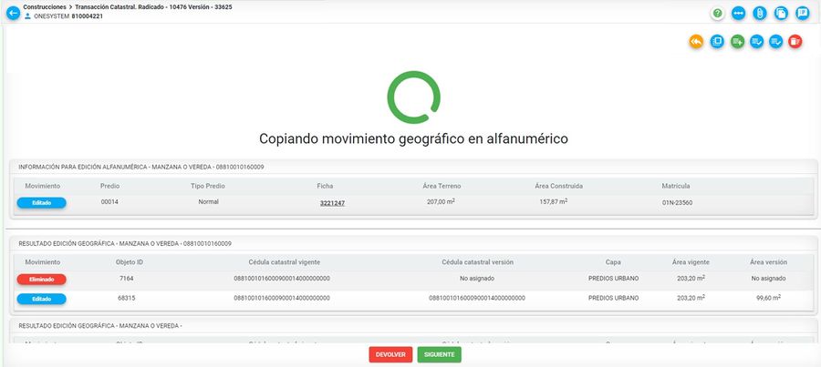 Al '''finalizar''' la edición geográfica y pasar a la actividad '''Transacción Catastral''' el sistema automáticamente replica los cambios geográficos en lo alfanumérico. | Al '''finalizar''' la edición geográfica y pasar a la actividad '''Transacción Catastral''' el sistema automáticamente replica los cambios geográficos en lo alfanumérico. | ||