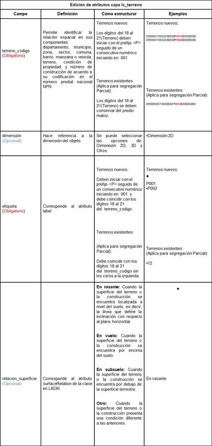 '''Edición de atributos capa terreno:''' En la capa '''lc_terreno''' se deben diligenciar los siguientes atributos correspondientes a los campos descritos a continuación: | '''Edición de atributos capa terreno:''' En la capa '''lc_terreno''' se deben diligenciar los siguientes atributos correspondientes a los campos descritos a continuación: | ||