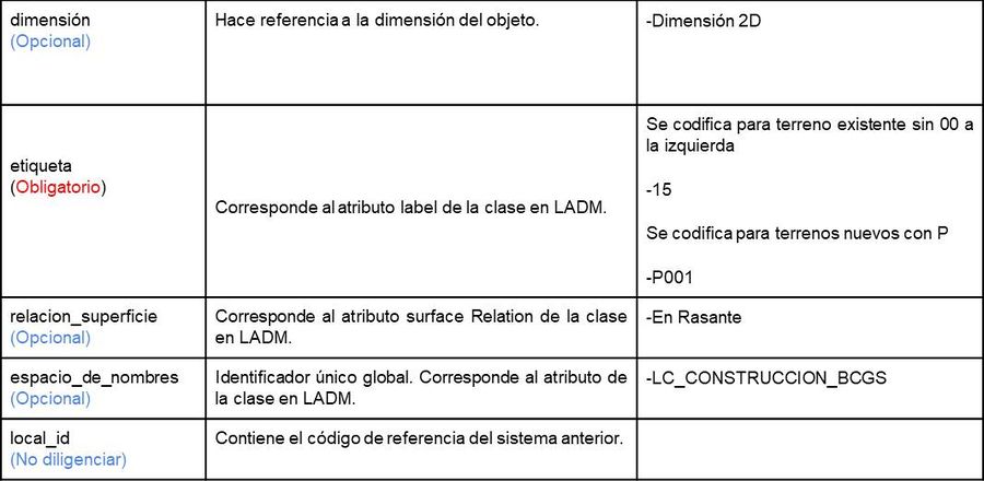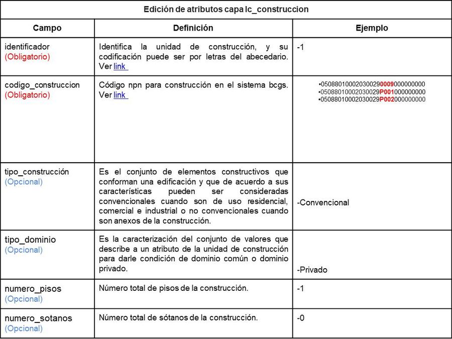 '''Edición de atributos capa construcción:''' En la capa lc_construccion se deben registrar los atributos de los campos descritos a continuación: | '''Edición de atributos capa construcción:''' En la capa lc_construccion se deben registrar los atributos de los campos descritos a continuación: | ||
