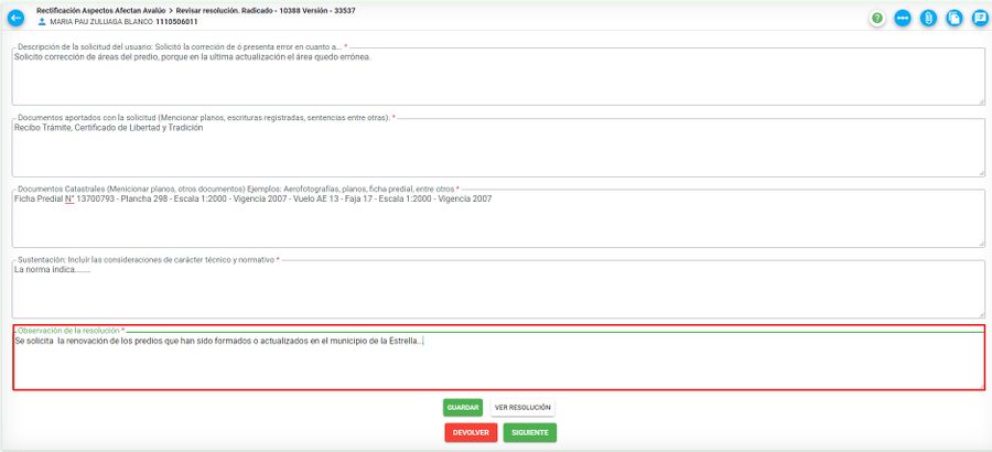 En esta actividad se debe llenar el espacio Observación de la resolución y clic en el botón Guardar