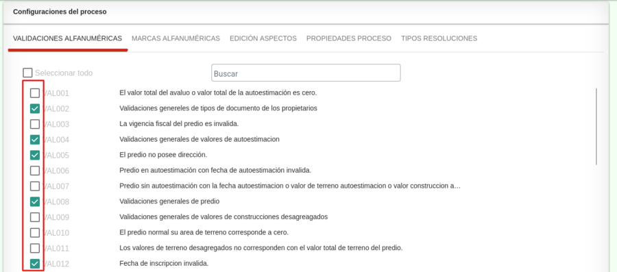 Seleccionar la casilla por cada validación que debe tener en cuenta el proceso para la actividad de '''Transacción Catastral''' | Seleccionar la casilla por cada validación que debe tener en cuenta el proceso para la actividad de '''Transacción Catastral''' | ||