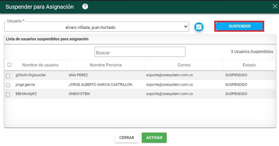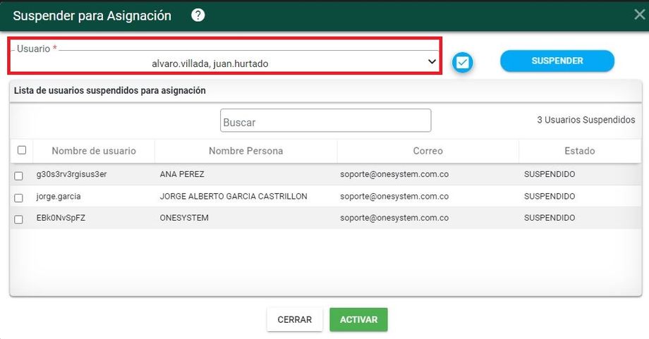2. Seleccione uno o varios usuarios a suspender para asignación