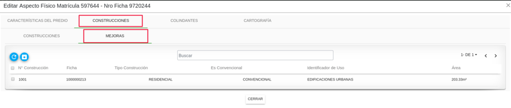 Para registrar una construcción de mejora, se debe de seleccionar la construcción en el recuadro que se muestra al iniciar la fila del registro.