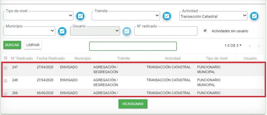 Al dirigirse nuevamente a la ventana de Reasignación masiva de actividades, se observa el cambio