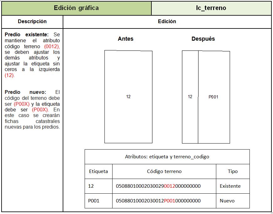 Edición gráfica capa terreno: En el siguiente cuadro se detallan de forma gráfica y con ejemplos la edición para los predios reglamentados: