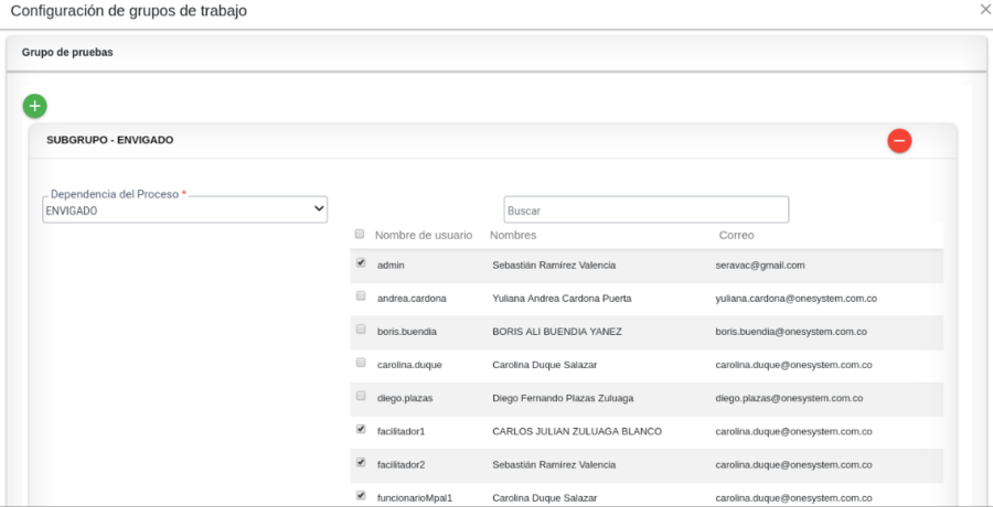 Seleccionar los usuarios que pertenecerán a la dependencia que se está configurando.