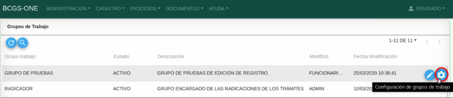 Por medio de esta funcionalidad se permite realizar la configuración de los grupos de trabajo que podrán acceder a la aplicación segun las dependencia configurada.