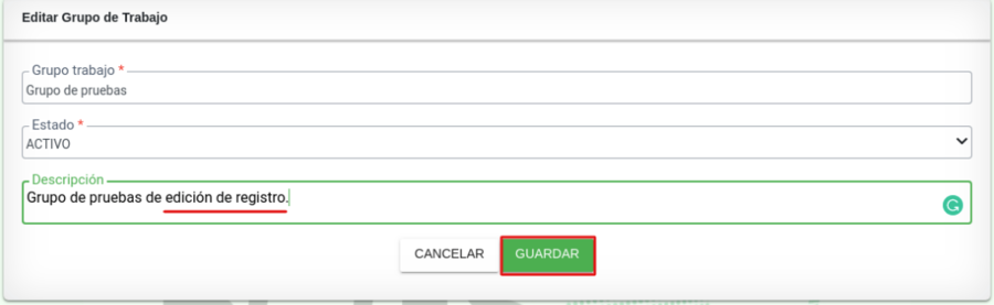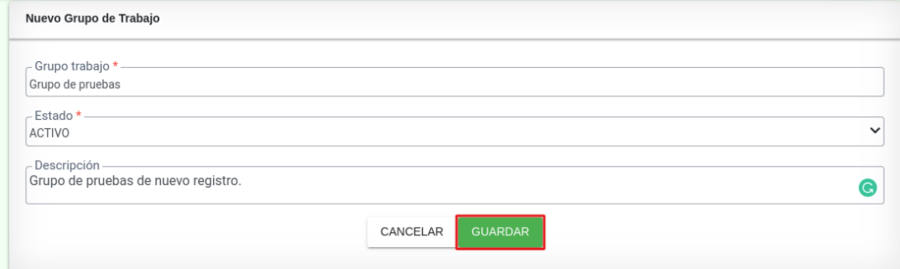 Se muestra un formulario donde se registra la nueva información como: nombre del grupo de trabajo, estado y descripción.