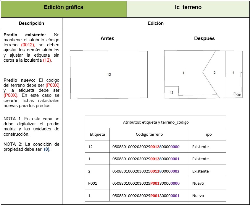 2. Edición atributos: El siguiente cuadro se detalla gráfica y numéricamente los predios nuevos o existentes de tipo normal.