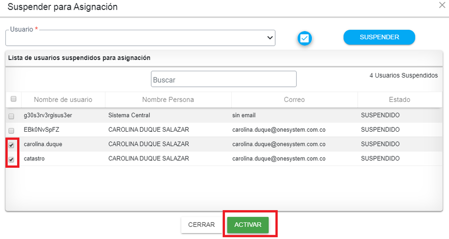 • Si no se desea reasignar, cierre la ventana (X) o con el botón CANCELAR. Se muestran los usuarios suspendidos en el listado. Seleccione el o los usuarios a activar nuevamente y posteriormente el botón ACTIVAR