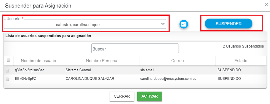 • Seleccione uno o varios usuarios a suspender para asignación y posteriormente de clic en el botón SUSPENDER