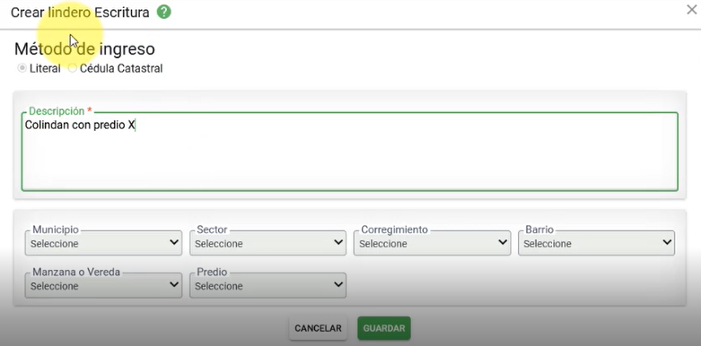 En el campo descripción diligenciar la información del lindero de las escrituras y seleccionar el botón guardar lindero, confirmar dando clic en ACEPTAR