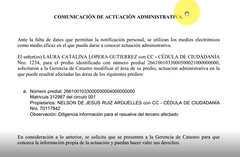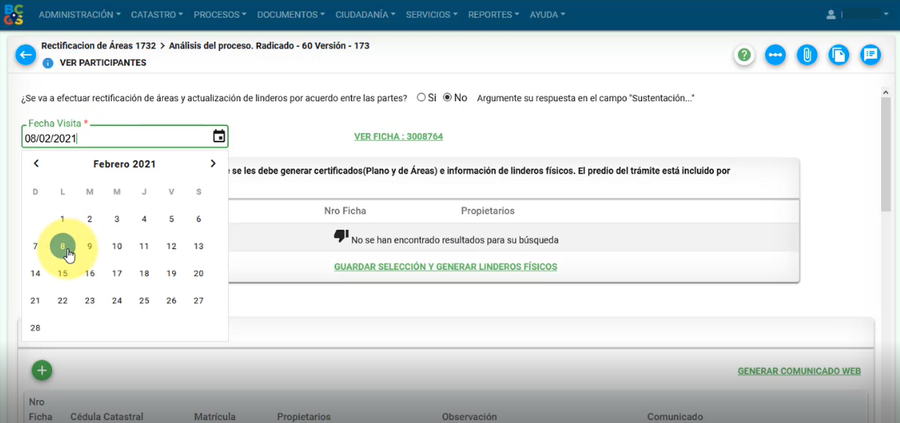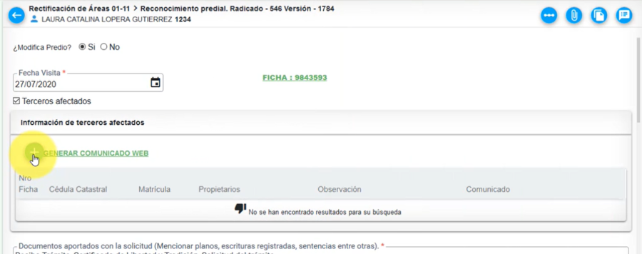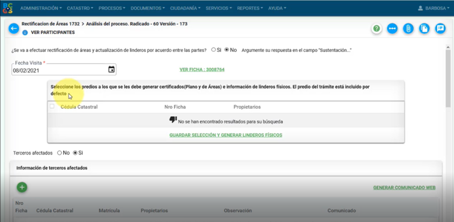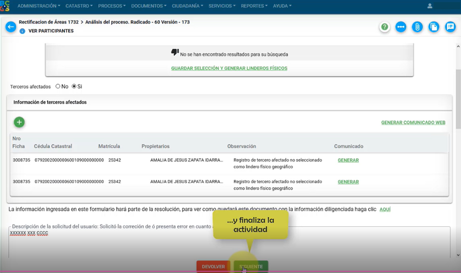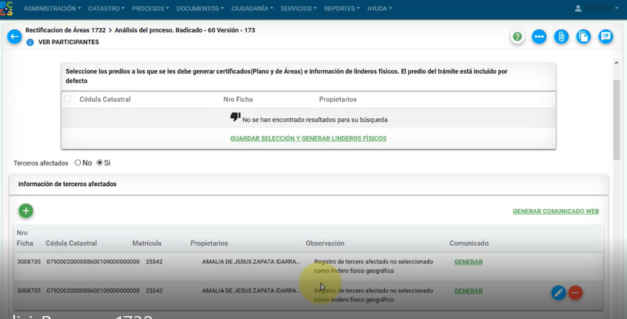 A continuación, se muestra la información general del tercero afectado, como: número de ficha, cédula catastral, matrícula y propietario; el cuál puede ser modificado, por medio del botón editar