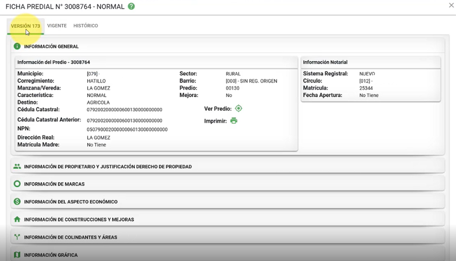 Para consultar la información del predio en versión, selecciona el número de ficha