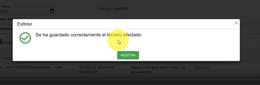 Dar clic en GUARDAR para almacenar el tercero afectado y posteriormente ACEPTAR