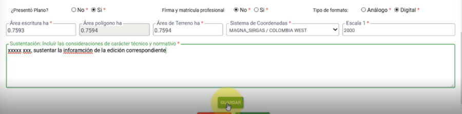El sistema muestra en modo lectura el área del polígono geográfico.Registra la información de áreas de terreno y escritura según corresponda. Posteriormente selecciona el sistema de coordenadas y diligencia el campo sustentación. Dar clic en el botón guardar para almacenar la información registrada.