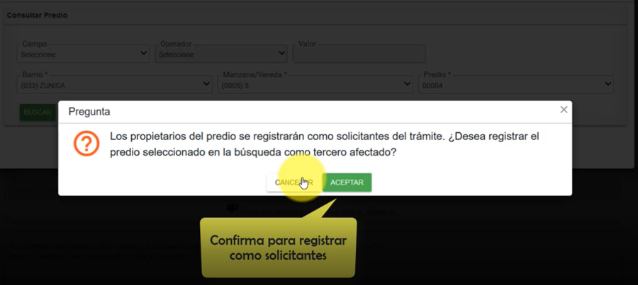 El sistema muestra un mensaje indicando que los propietarios se registrarán como solicitantes al trámite. Dar clic en aceptar para confirmar el registro