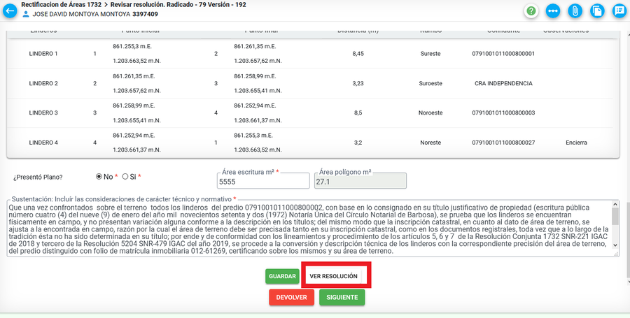 En la resolución se visualiza toda la información diligenciada en la actividad de ANÁLISIS DEL PROCESO y se muestra gráfico del predio, cuadro de descripción de linderos y el cuadro de los cambios (antes y despúes)
