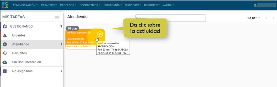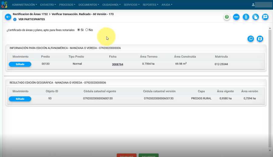 Al entrar al trámite, el sistema muestra el resultado tanto de la edición geográfica como alfanumérica