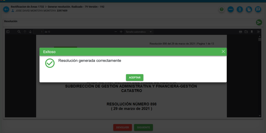 El sistema carga la ventana para previsualizar la resolución (Esto puede tardar algunos segundos dado que se están obteniendo las imágenes de los predios)
