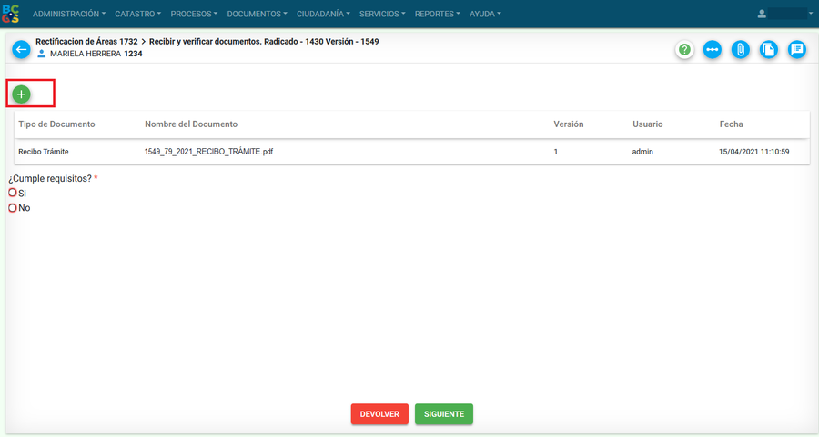 Luego, una vez anexados los documentos respectivos deberá responder la pregunta: ¿ Cumple requisitos? Si la respuesta es NO, el sistema finalizará la actividad y pasará a la actividad de ....