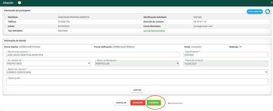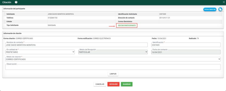 Completar la información de la citación. En caso que la información del solicitante no esta completa, ingresar al link "Editar participante"