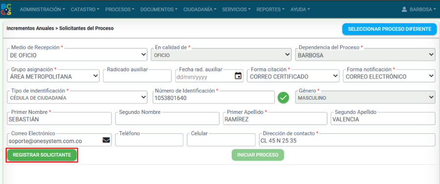 Diligenciar los datos solicitados para el registro del proceso y seleccionar el botón Registrar Solicitante