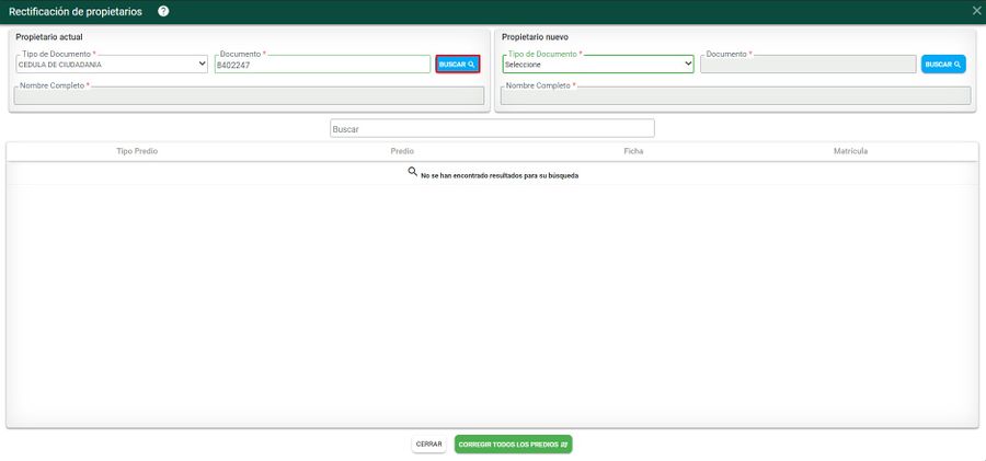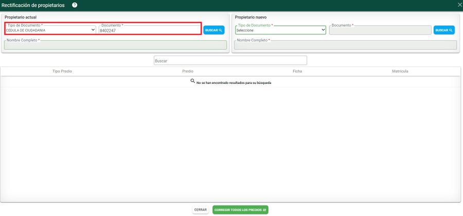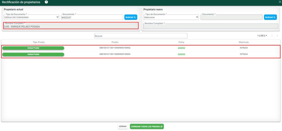 El sistema automáticamente trae el registro del propietario actual y los predios o unidades prediales que son propiedad de dicha persona.