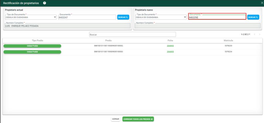 El sistema automáticamente trae el registro del propietario actual y los predios que son de su propiedad.