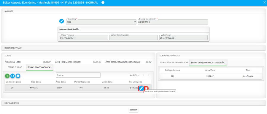 Finalmente ingrese el área de la zona geoeconómica, tomándola de la información geográfica. Clic en el botón Aceptar para que se guarden los cambios.
