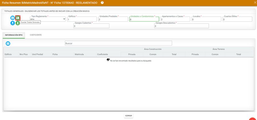 Desde esta actividad se permite verificar la información del reglamento. Para ello seleccionar la Ficha del predio matriz.