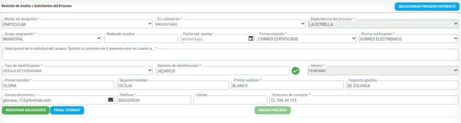Los datos faltantes se deben diligenciar manualmente y dar clic al botón Registrar solicitante