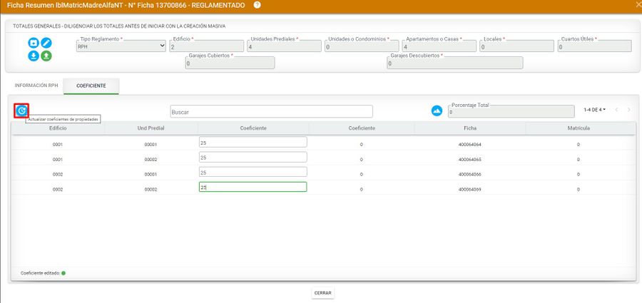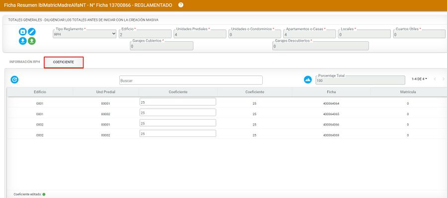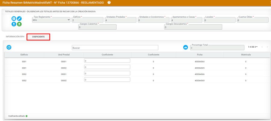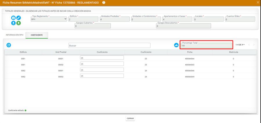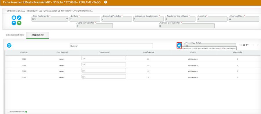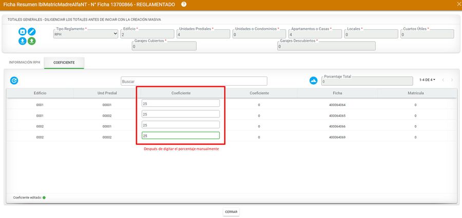 El sistema automáticamente asigna los demás porcentajes de las unidades prediales del segundo edificio y completar el 100%