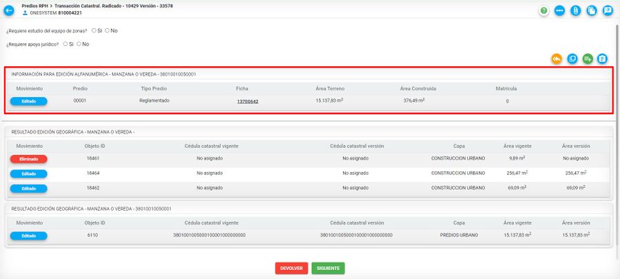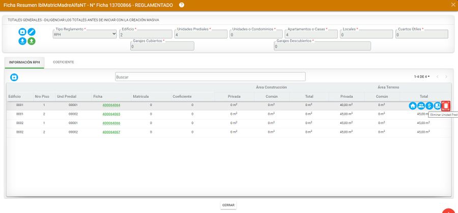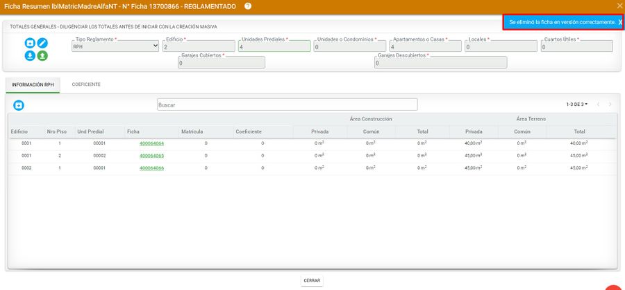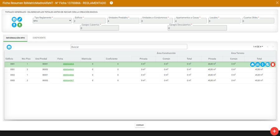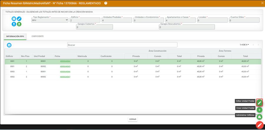 Desde esta actividad se permite verificar la información del reglamento. Para ello seleccionar la Ficha del predio matriz.